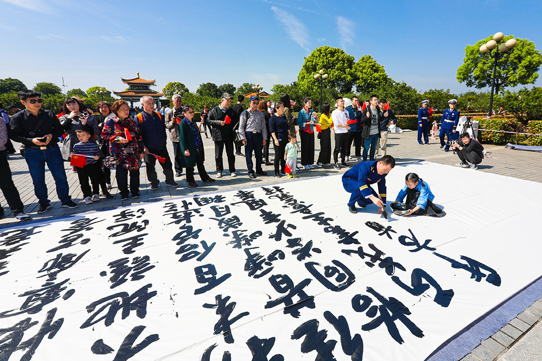 随后,全体消防指战员集体朗诵《沁园春 长沙》。饱含深情、铿锵有力的朗读声响彻整个橘子洲头,深深地感染了在场的每一名游客。“场面太震撼了,看到这些年轻的指战员们,我为祖国的强大感到自豪,为我们有这样的消防英雄而骄傲!”,现场观众跟随朗诵声挥舞小国旗,在活动主题展板上写下祝福话语。