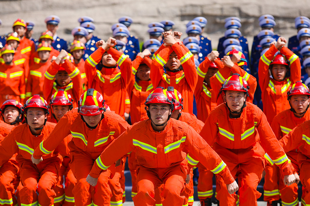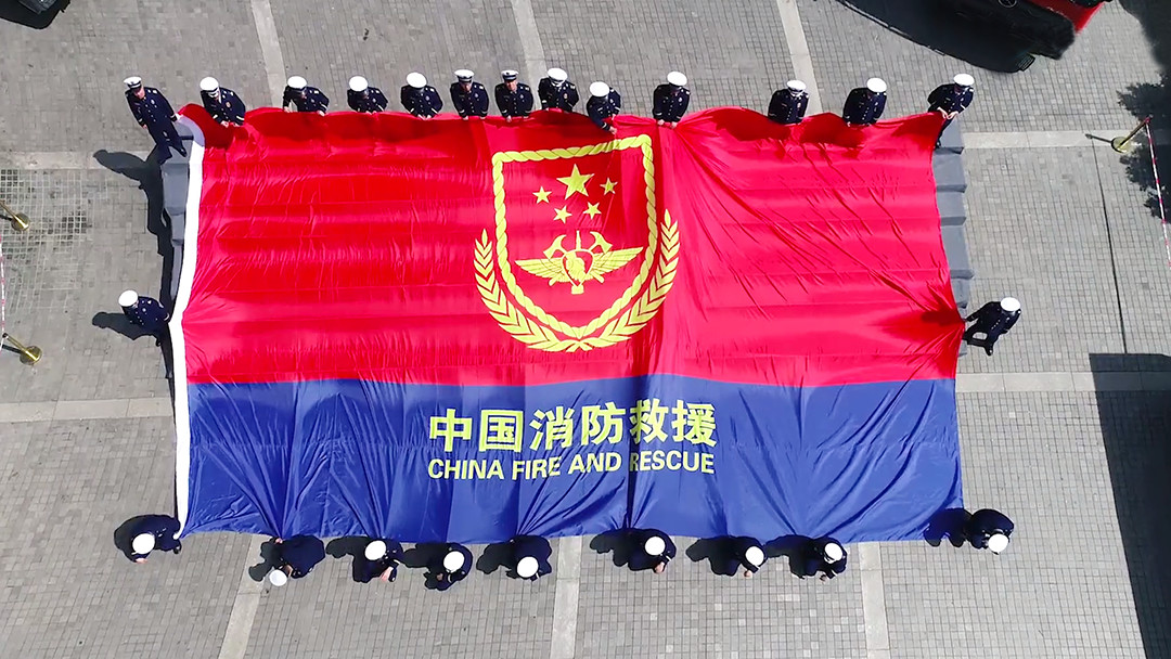 在全场欢呼声和掌声中,身着火焰蓝制服和橘红色抢险救援服的消防指战员走下舞台,在广场中央摆出“五四”队型,18米宽的中国消防救援队旗也随即拉开,巨幅书法、五四队型、巨型队旗,在毛泽东青年艺术雕像前融合成一体,格外壮观,“对党忠诚、纪律严明、赴汤蹈火、竭诚为民”,活动在全体消防指战员高昂的口号声中、在向祖国、向消防致敬声中达到高潮。