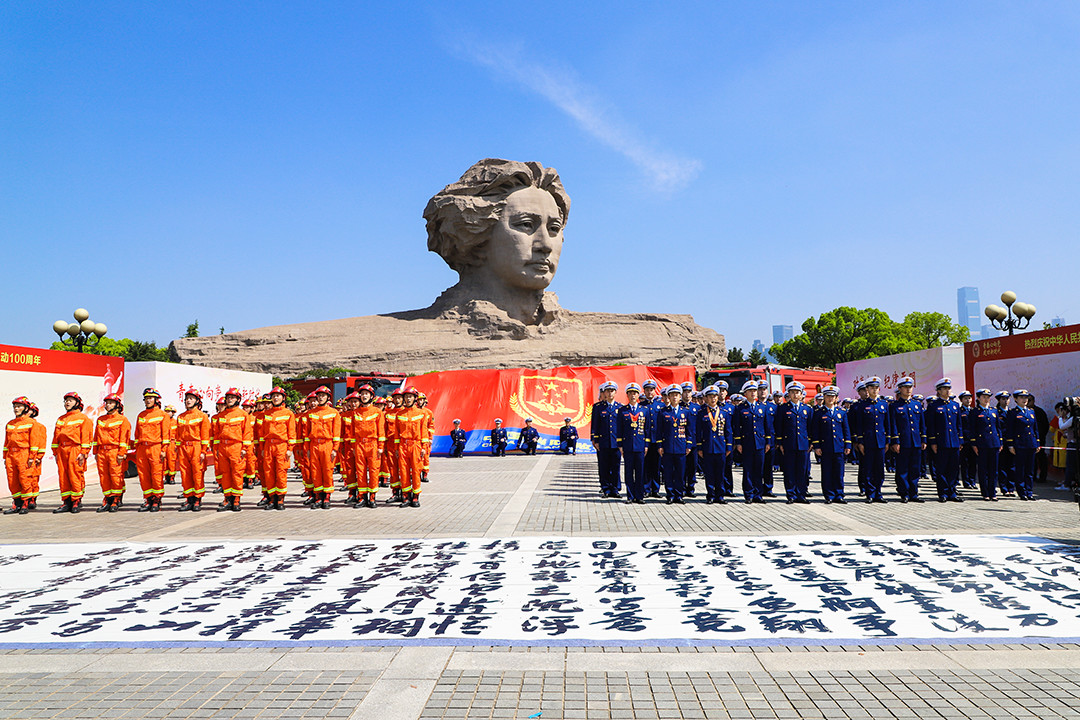 五四前夕,湖南消防总队近300名青年指战员,以青春的名义,齐聚长沙橘子洲毛泽东青年艺术雕像前,深情朗诵伟人诗词《沁园春·长沙》,结合传播消防知识、创作巨幅书法、表演消防仪仗舞等多种形式,展现三湘消防铁军新风采,纪念五四运动100周年,献礼新中国70华诞。